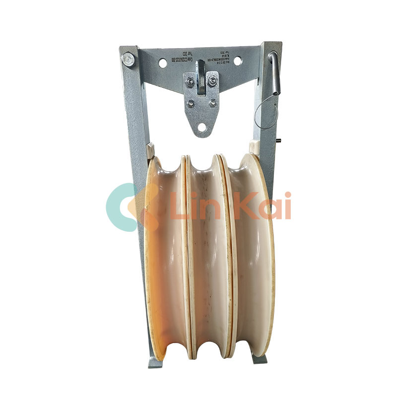 บล็อกการร้อยสายขนาดเส้นผ่านศูนย์กลางขนาดใหญ่ 660 มม. บล็อกการร้อยสายตัวนำมัดสามเส้นใช้สำหรับการร้อยตัวนำสองหรือสามตัวบนสายส่งเหนือศีรษะ มัดอาจทำจากเหล็ก (ส่วนกลาง) ไนลอน หรือโลหะผสมอลูมิเนียม